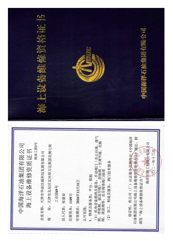 中海油海上設(shè)備維修資質(zhì)證書
