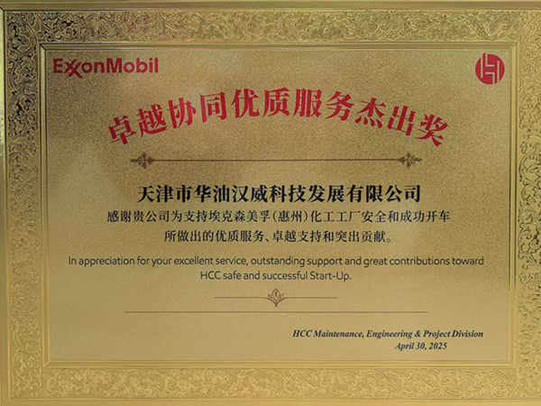 近期,天津市華油漢威科技發(fā)展有限公司(簡稱“華油漢威”)憑借在埃克森美孚惠州乙烯項目專業(yè)高效的服務(wù),圓滿完成了大量閥門試壓及開車前維修服務(wù)工作,為項目順利推進(jìn)提供了堅實保障,并因此榮獲“??松梨谧吭絽f(xié)同優(yōu)質(zhì)服務(wù)杰出獎”。該獎項旨在表彰“華油漢威”在美孚工…
